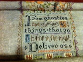 It has been a long time since my last post, but that doesn't mean I haven't been stitching. Work has been busy and it has slowed me down some, but I have several projects in progress and a couple of finishes as well. My first big finish is the Lizzie Kates - Very Scary Mystery Sampler SAL. This is one of my favorite projects of all time. I love Halloween and the colors are amazing. There are also a few specialty stitches thrown in for extra visual interest. I hope to have this one framed by next Halloween.
